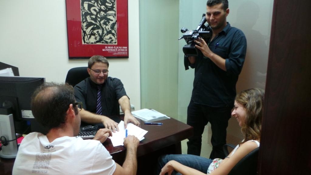 מעיין ורן חותמים בפני עו"ד יונתן דניאל הופמן במשרדינו בצילומים לטלוויזיה הצרפתית