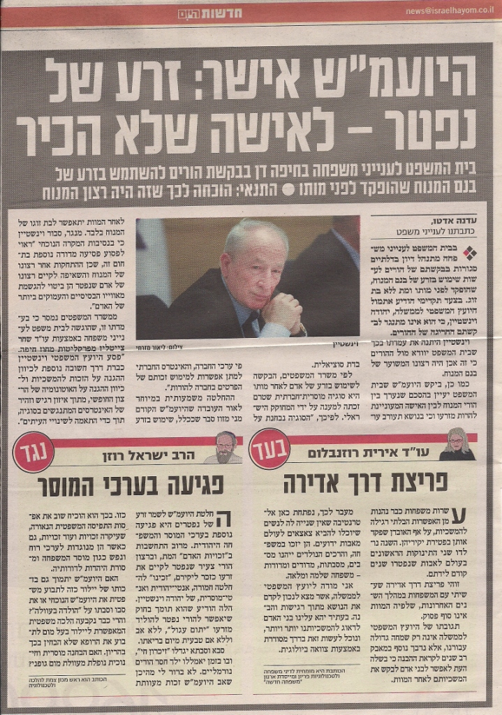בעקבות עתירה חדשה שהוגשה על ידינו לבית משפט למשפחה בחיפה, הודיע היועץ המשפטי לממשלה על שינוי עמדתו ביחס לצוואה הביולוגית וזכות השימוש בחומר הגנטי על ידי הורי אדם שנפטר. בעתירתנו כנגד המדינה עתרנו יחד עם הורי הצעיר שנפטר לקבל אישור לעשות שימוש בזרעו. לפני כשבועיים הודיע היועץ המשפטי לממשלה יהודה ויינשטיין, בפעם הראשונה מזה 12 שנים של מאבק שמנהלת עו"ד אירית רוזנבלום מטעם הורי נפטרים כנגד המדינה, כי הוא מוכן לקבל את עמדתה ועמדת הורי הנפטר המבקשים להמשיך את מורשתו ולעשות שימוש בזרעו. כזכור המקרה הראשון של החייל קיוון כהן ז"ל שנהרג בעזה ב 2002, מטופל מאז ועד היום על ידי עו"ד רוזנבלום שם לראשונה גילה היועמ"ש את התנגדותו לבקשת הורי הנפטר לאפשר להם למצוא אישה שתגדל ילד מזרע בנם ותהא לו לאם לכל דבר ועניין.