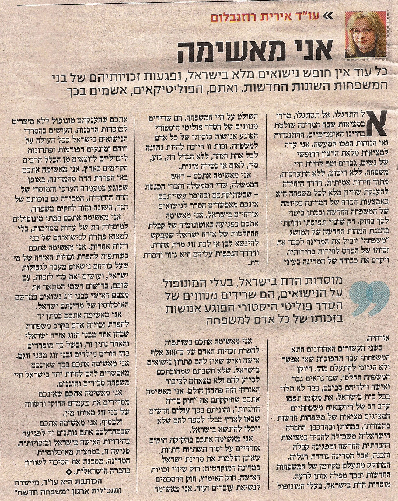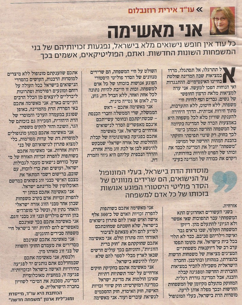 אני מאשימה אתכם: ראש הממשלה, שרי הממשלה וחברי הכנסת, שבשתיקתכם, בחוסר עשייתכם, אינכם מאפשרים הסדר לנישואין אזרחיים בישראל (המסמך המלא להורדה כאן)
