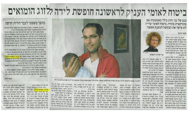 ארגון משפחה חדשה זכה בעתירה נגד ביטוח לאומי ומעתה גם גברים יקבלו זכויות לידה – תומר זרחין הארץ 16.3.09