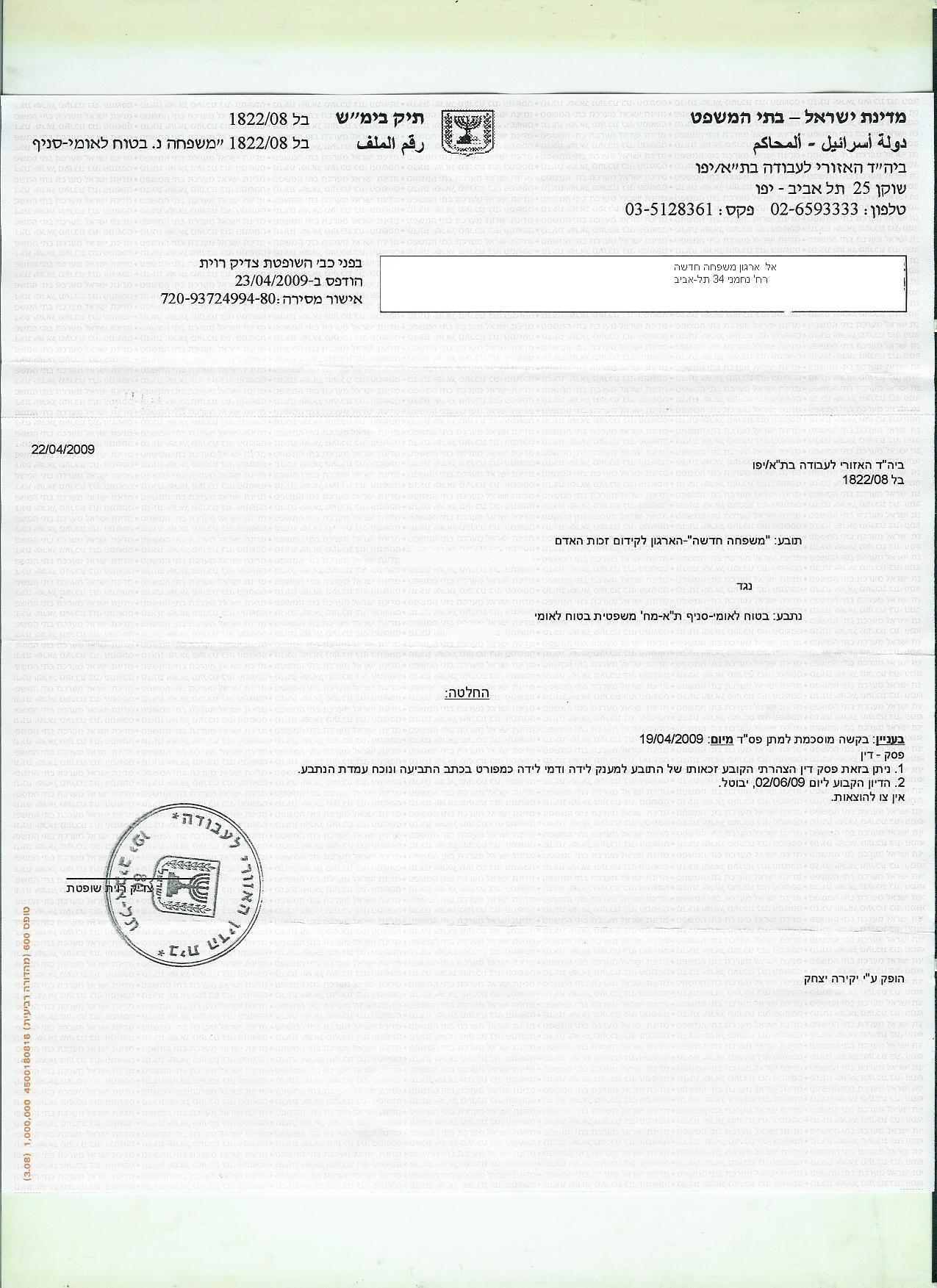 בית הדין לעבודה קיבל את עתירת ארגון משפחה חדשה בעניינם של שני גברים אבות לתאומות, שנולדו באמצעות פונדקאית. בפסק דין הצהרתי קצר ונחרץ קובעת השופטת רוית צדיק, מבית הדין לעבודה בתל אביב, כי, האב התובע את דמי הלידה ומענק הלידה יוכל לקבלם. לא נקבע צו להוצאות והמהפיכה יצאה לדרך. פסק הדין ניתן לאחר שבדיון המשפטי תבע ארגון משפחה חדשה שינוי סדרי הוראות המוסד. בעקבות זאת, נאלץ הביטוח הלאומי להקים ועדה לבחינת עניינם של בני זוג מאותו המין ואת מסקנותיה הביא בפני בית משפט. בעקבות מסקנות הועדה, השתנו נהלי המוסד לביטוח לאומי ומעתה, יוכלו בני זוג מאותו מין שהסתייעו בפונדקאות לקבל את דמי הלידה ומענק הלידה.