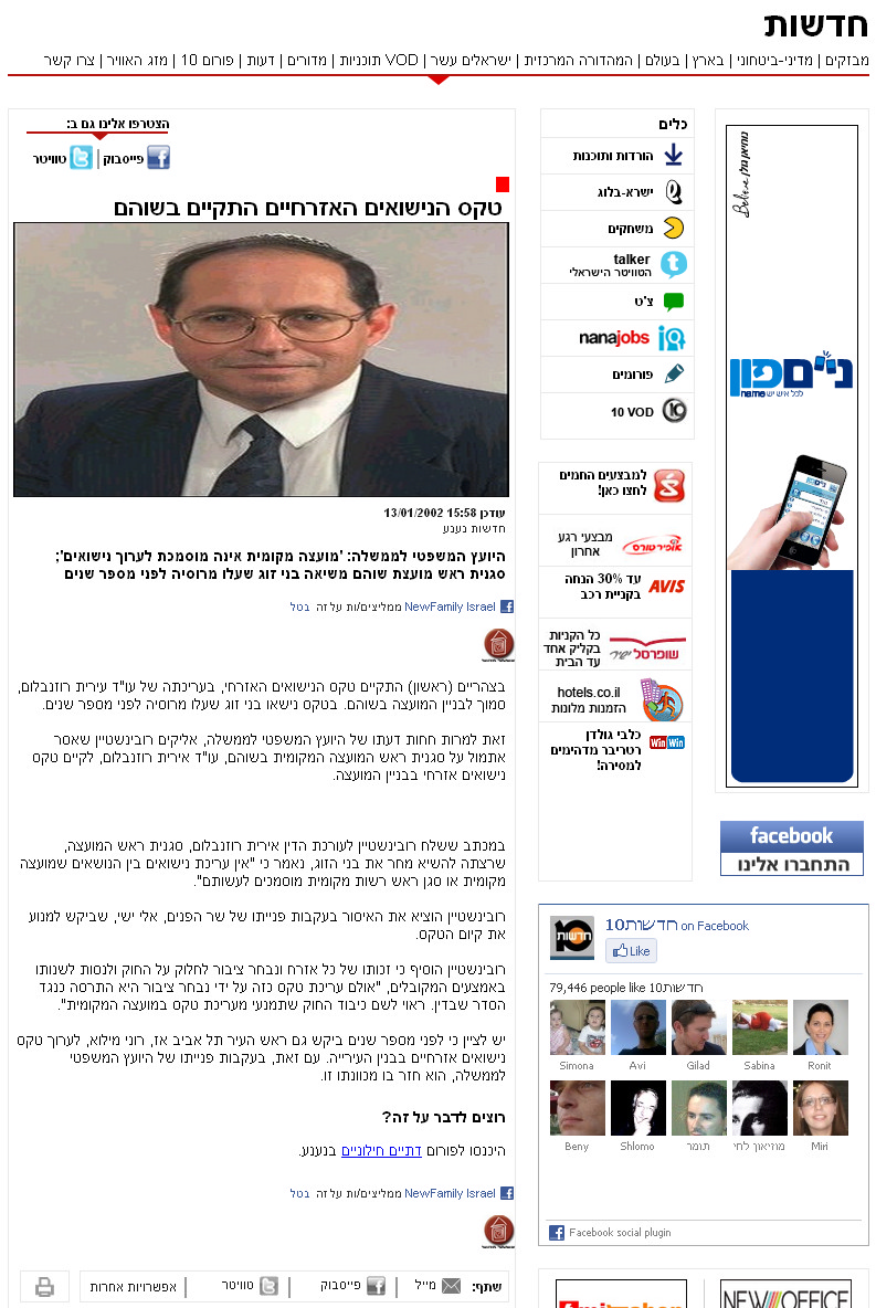 זאת למרות חוות דעתו של היועץ המשפטי לממשלה, אליקים רובינשטיין שאסר אתמול על סגנית ראש המועצה המקומית בשוהם, עו"ד אירית רוזנבלום, לקיים טקס נישואים אזרחי בבניין המועצה.