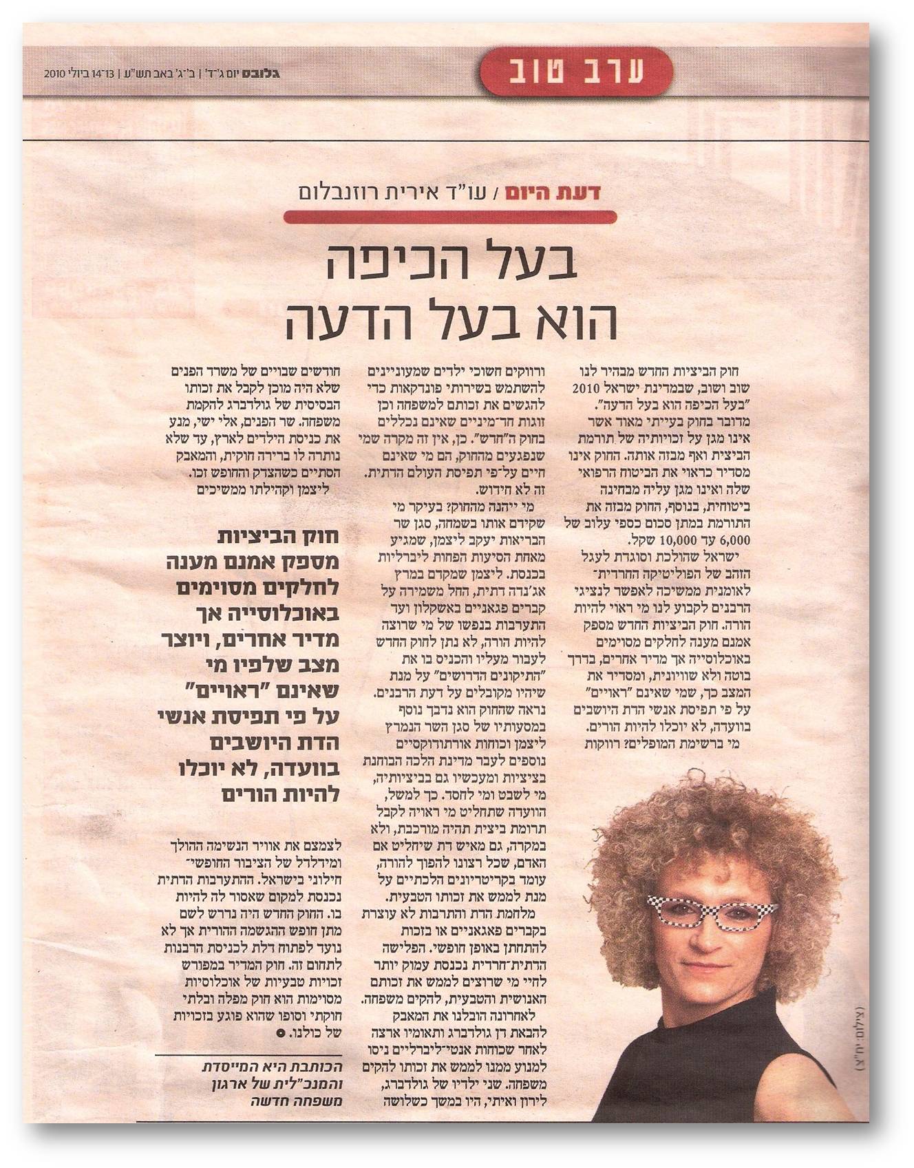 חוק הביציות החדש מבהיר לנו שוב ושוב, שבמדינת ישראל 2010 "בעל הכיפה הוא בעל הדעה". מדובר בחוק בעייתי מאוד אשר אינו מגן על זכויותיה של תורמת הביצית ואף מבזה אותה. החוק אינו מסדיר כראוי את הביטוח הרפואי שלה ואינו מגן עליה מבחינה ביטוחית, בנוסף, החוק מבזה את התורמת במתן סכום כספי עלוב של 6,000 עד 10,000 שקל.