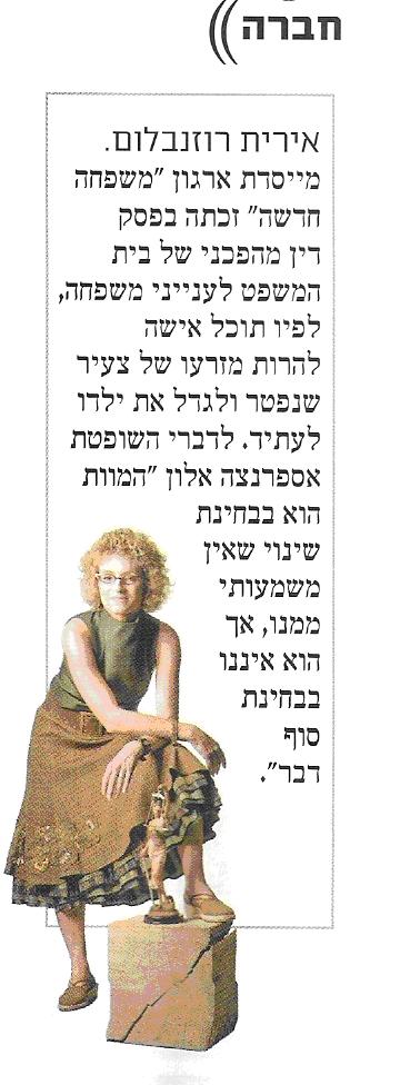 פסק הדין המאפשר לאישה רווקה להרות מזרע של חיל שנפטר, הפך לשיחת היום בעולם החברתי. פעילותה של עו"ד אירית רוזנבלום מי שמנהיגה את הרעיון קרוב לעשור, מעמידה אותה כגורם חברתי משפיע בפיתחו של העשור השני במילניום השלישי. לדברי רוזנבלום, מדובר בפריצת דרך עולמית ושינוי שישפיע עלינו מהלך השנים הקרובות.
