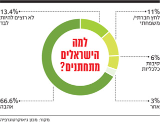 שיקולים כלכליים גם אינם מובילים ישראלים להתחתן, או כך לפחות הם טוענים. למעשה, מהסקר עולה כי, זהו השיקול השולי ביותר (6%). לדעת 66.6% מהנשאלים, הסיבה העיקרית לנישואים היא פשוט אהבה. 13.4% מאמינים שהמניע העיקרי לחתונה הוא הפחד מבדידות. עם זאת, מנתוני המחקר עולה כי ככל שהגיל שבו מתחתנים מבוגר יותר, השיקול הכלכלי מקבל יותר ויותר חשיבות.