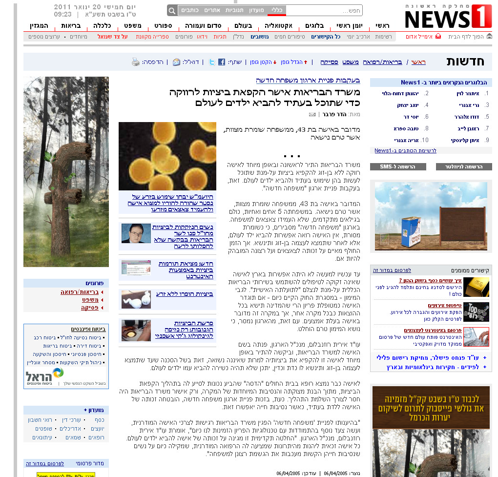 משרד הבריאות התיר לראשונה ובאופן מיוחד לאישה רווקה ללא בן-זוג להקפיא ביציות על-מנת שתוכל לעשות בהן שימוש בעתיד ולהביא ילדים לעולם. זאת, בעקבות פניית ארגון "משפחה חדשה".