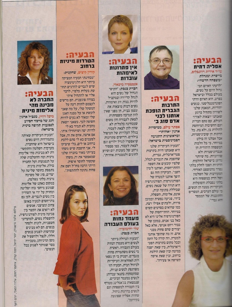 מה הבעיה המטרידה ביותר נשים בישראל? האם זו אלימות מינית? אפליה? אי שוויון כלכלי? הצורך לשלב בין עבודה למשפחה? אורית ראובני-גפן מעיתון לאישה, יצאה לברר אצל נשים בעלות השפעה בחברה, מה הן חושבות על מעמד האישה בישראל, עו"ד אירית רוזנבלום מנכ"לית משפחה חדשה, השתתפה במשאל הקצר. מה משפיע על נשים ומה מטריד אותן בחברה הישראלית לקראת תום העשור של האלף השלישי. לאישה 15.12.09