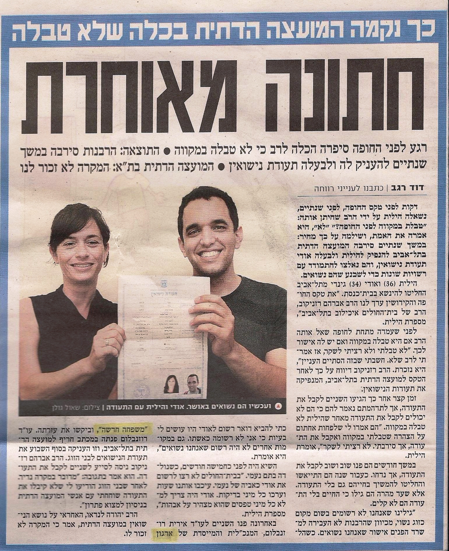 אם חשבתם שהרבנות מתגלה במלוא כיעורה רק כאשר מגיעים בשעריה לצורכי גירושין, חישבו שוב. בני ה זוג, הילית ואודי גינדי ממרכז הארץ נישאו כדת משה וישראל כבר לפני שנתיים, עם רב, חופה וקידושין אך התברר להם שהם אינם רשומים במשרד הפנים כזוג נשוי כיוון שהרבנות בחרה לטרטר אותם על מנת להנפיק להם את תעודת הנישואין המיוחלת.