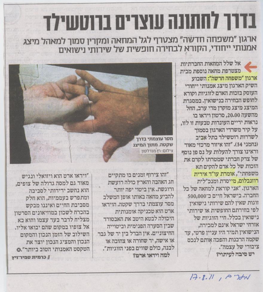 ארגון "משפחה חדשה" השיק בט"ו באב, מיצג אמנותי ייחודי העוסק בזכות האדם לזוגיות. במיצג מוקרן סרטון וידאו בו נראים זוגות ידיים העונדות טבעות זו לזו, הסרטון יוקרן כמחאה הקוראת לחופש הבחירה בנישואין.