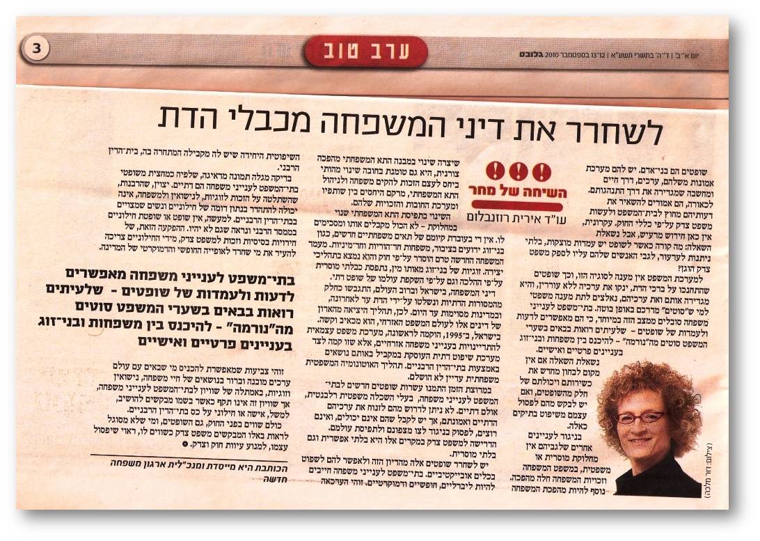 לשחרר את המשפחה מכבלי הדת / עו"ד אירית רוזנבלום גלובס 12.9.2010
