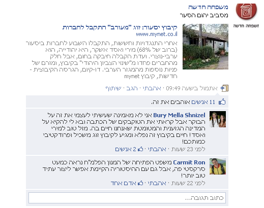 Bury Mella Shnizel: אני לא מאמינה שעשיתי לעצמי את זה על הבוקר אבל קראתי את הטוקבקים של הכתבה ובא לי להקיא על המדינה הגזענית והמטומטת שאנחנו חיים בה. מזל טוב למירי ואסד! חיים בקיבוץ זה נפלא ומגיע לקיבוץ זוג משכיל ופרודקטיבי כמותכם!