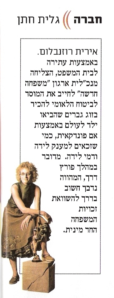 עו"ד אירית רוזנבלום מייסדת ומנכ"לית הארגון נבחרה על ידי העיתון גלובס אישה המשפיעה בחברה בחודש מאי 2009. זאת נוכח הצלחת התביעה המשפטית לקבלת זכויות לידה לבני זוג גברים שהביאו לעולם בנות תאומות באמצעות פונדקאות.