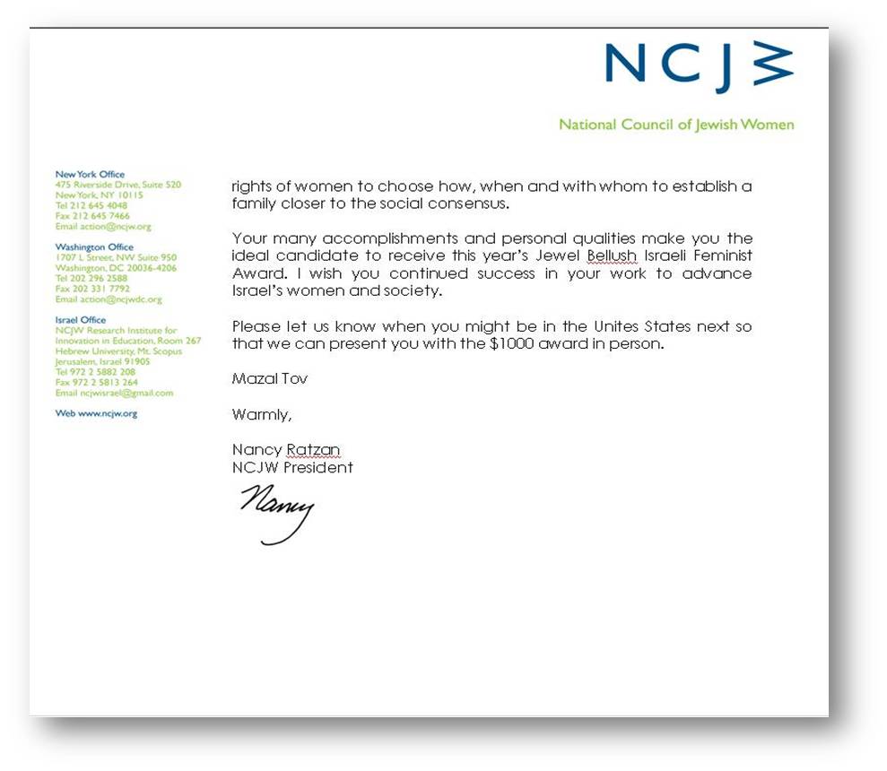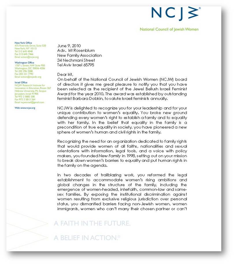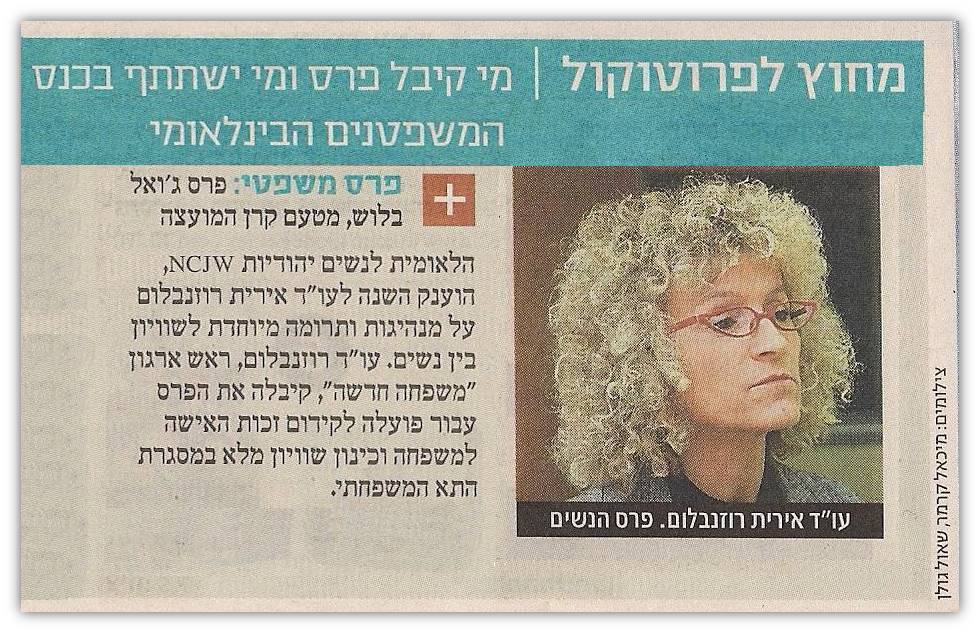 עו"ד אירית רוזנבלום זוכת פרס Jewel Bellush Israeli Feminist Award 2010 – הפרס מוענק מטעם המועצה הלאומית לנשים יהודיות NCJW