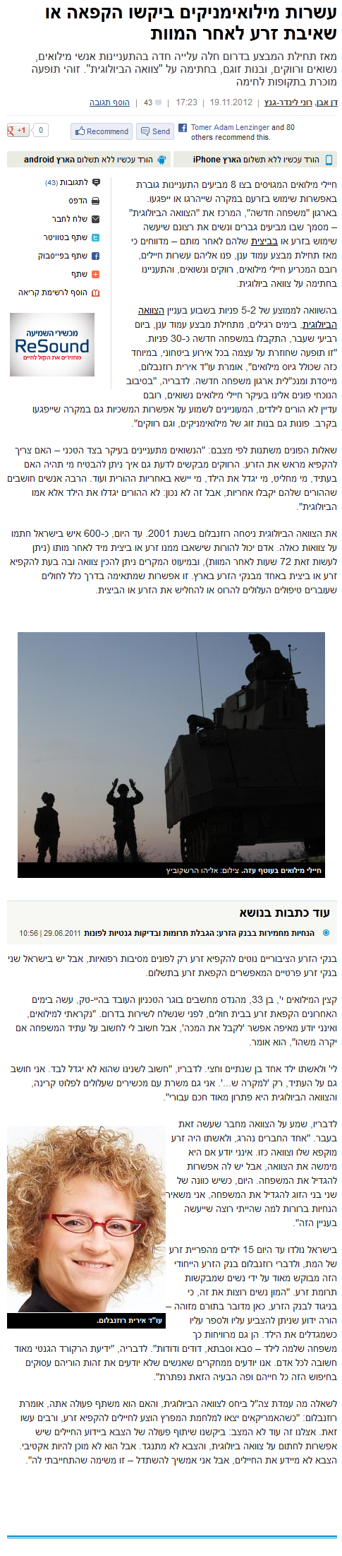 חיילי מילואים המגויסים בצו 8 מביעים התעניינות גוברת באפשרות שימוש בזרעם במקרה שייהרגו או ייפגעו. בארגון "משפחה חדשה", המרכז את "הצוואה הביולוגית" – מסמך שבו מביעים גברים ונשים את רצונם שיעשה שימוש בזרע או בביצית שלהם לאחר מותם – מדווחים כי מאז תחילת מבצע עמוד ענן, פנו אליהם עשרות חיילים, רובם המכריע חיילי מילואים, רווקים ונשואים, והתעניינו בחתימה על צוואה ביולוגית.