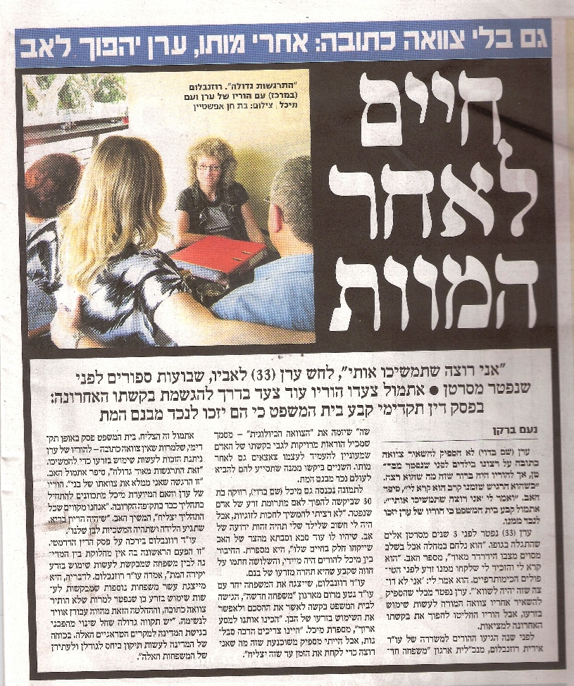 - ביום 1.2.12 נתנה לראשונה המדינה את הסכמתה למימוש צוואה ביולוגית ללא מאבק משפטי – ע'. חלה בסרטן וחש כי קיצו קרב מבלי שהספיק להגשים את עצמו, הוא רצה ילדים ומשפחה, בערוב ימיו ביקש מהוריו שימשיכו את מורשתו הוא הקפיא זרע וציווה להם את החיים. 7 שנים לאחר מותו נתנה המדינה את הסכמתה לאפשר לו למשפחתו ולאם מיועדת להביא ממנו ילד לעולם. האם המיועדת תוכל להפוך לאם ילדיו לגדלם ולהכיר להם את סבם, סבתם ודודיהם. המשפחה המורחבת מחכה לילד ממשיך מורשות של ע'.