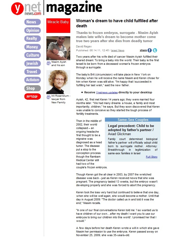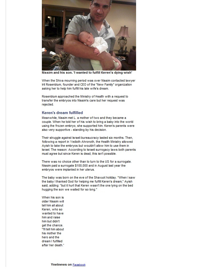 A few days before her death Keren wrote a will in which she gave Nissim her permission to use the embryos. Keren passed away on November 25, 2009, she was 35-years-old.