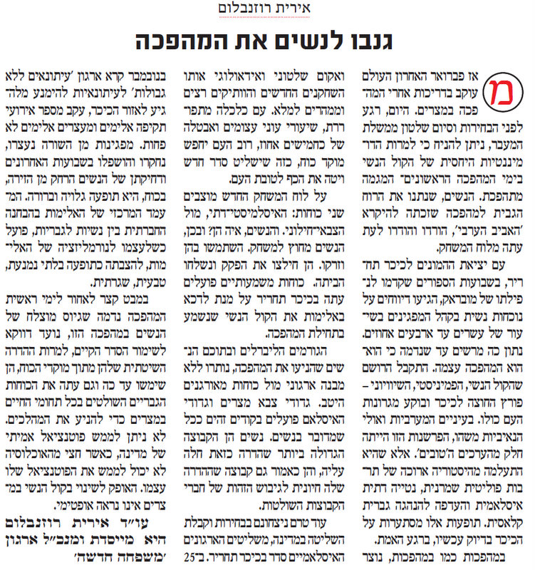 בתאריך 28.11.11 פורסם במדור הדעות מאמרה של אירית רוזנבלום בנושא מעמד הנשים במצרים בעקבות המהפכה, מתוך הכתבה: